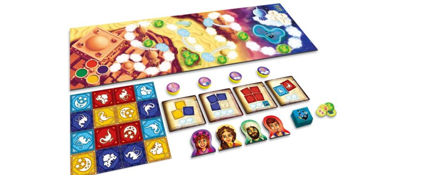 Le jeu Magic Fold est très complet et coloré : il contient un plateau de jeu, des pions de jeu, des jetons personnages, des jetons génie, des jetons cobra, des pions d’initiative, des cartes défis (standards et avancées) et 4 tapis volants.